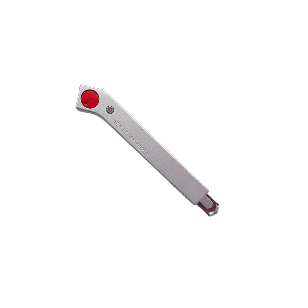 Cuenta con sistema de cartucho que guarda hasta 5 cuchillas, lo que facilita cambios rápidos y seguros. Su bloqueo automático tipo trinquete asegura un corte firme y estable, mientras el rompedor de cuchillas triangular prolonga la vida útil del filo.